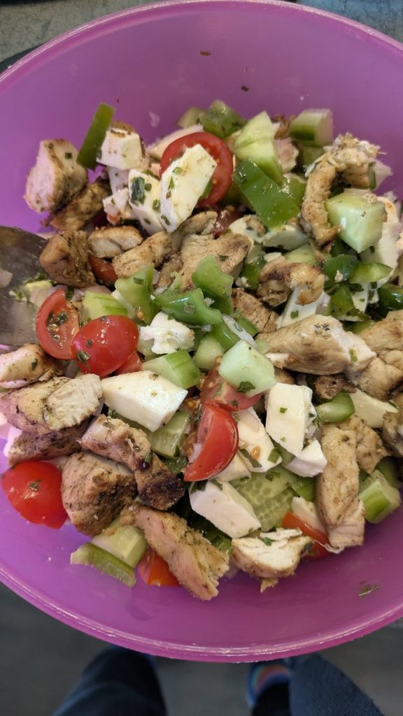 Frischer Gyrossalat – Schnell, lecker und perfekt für jede Gelegenheit Ein erfrischender Salat mit würzigem Hähnchen, knackigem Gemüse und cremigem Mozzarella – ideal als Low Carb Abendessen (für meinen Weg…