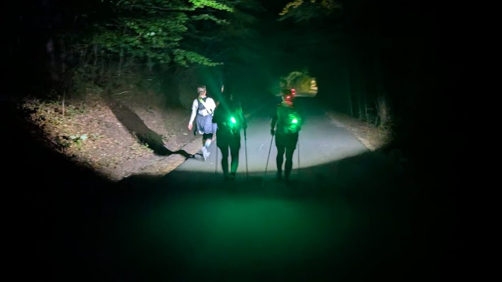 Sie war in guten Händen. Und dann, wie ein Wink des Schicksals, tauchten genau in diesem Moment die Schlussläufer Ines und Alex mit ihren Stirnlampen aus dem Wald auf – und sammelten mich ein. Sie bauten mich auf und unterhielten mich gut. Die beiden nahmen ihre Verantwortung als Schlussläufer sehr ernst und sorgten sich auch gleichermaßen um die beiden Mädels kurz vor uns. So marschierten wir weiter bis zum nächste Versorgungspunkt.