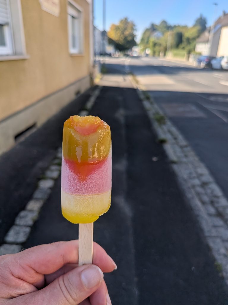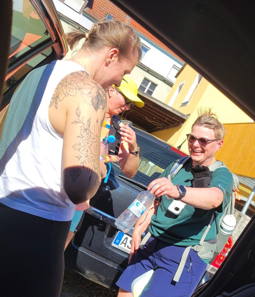 Start war um 9.30 Uhr in Sulzbach-Rosenberg. Wir hatten uns einen groben Zeitplan erstellt und diesen habe ich uns als Tattoos zum aufkleben erstellt. Leider haben auch die Tattoos der Hitze auch nicht lange standgehalten. Merke fürs nächste Mal: wasserfesten Stift! Die Hitze war enorm, die Etappe Asphalt lastig. Das hat echt „Körner“ gekostet. Ich hatte Powercarb Heat in meinen Flaschen. Wie gewohnt hatten wir ausreichend Getränke inkl. Elektrolyte dabei. Auch Sonnenschutz und passende Kleidung war am Start. Von Meli und Rene wurden wir auch mit Eis und Eiswürfeln zur Abkühlung überrascht. Ein echtes Highlight!