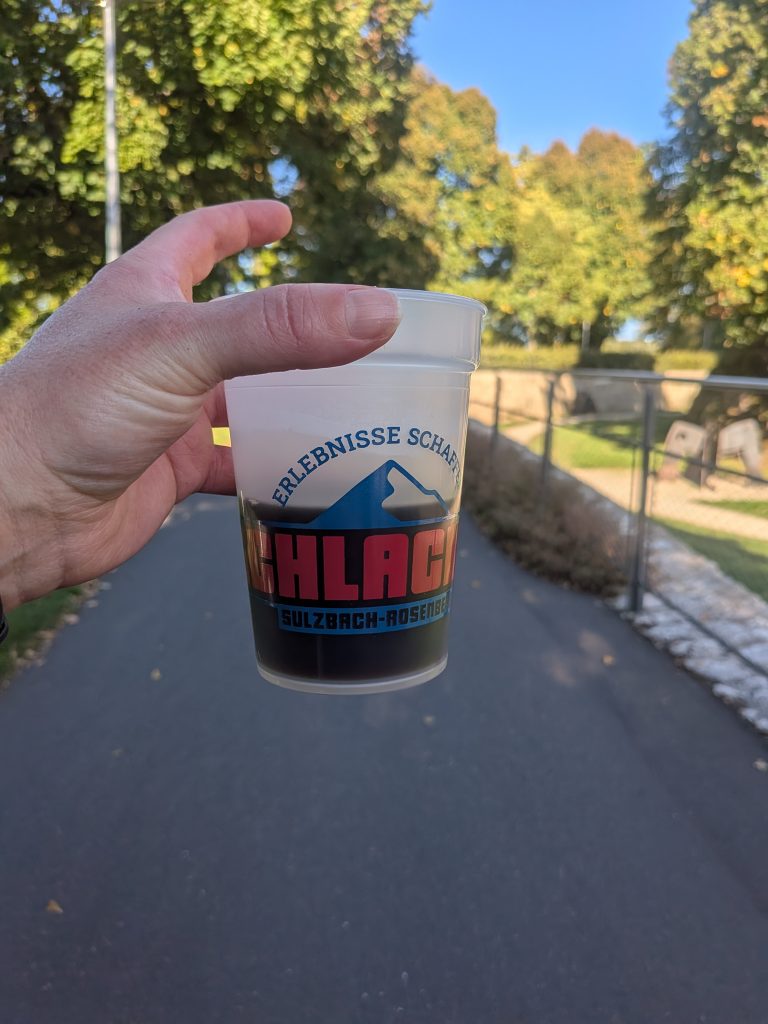 Und tatsächlich holte ich auf und kam auch wieder in Sichtweite der beiden Mädels. Eine blieb an der legendären Schnapsstation bei Kilometer 98 stehen (ja, so was gibt es wirklich ). Ich aber wusste: Wenn ich da jetzt anhalte, komme ich nicht mehr hoch. Also weiter. Schritt für Schritt, bis ich um 9:30 Uhr (pünklich nach 24 Stunden und zum Glockenläuten) durchs Ziel lief. Dort wurde ich freudig von Familie und Freunden erwartet und empfangen! Auch Buddy war dabei.