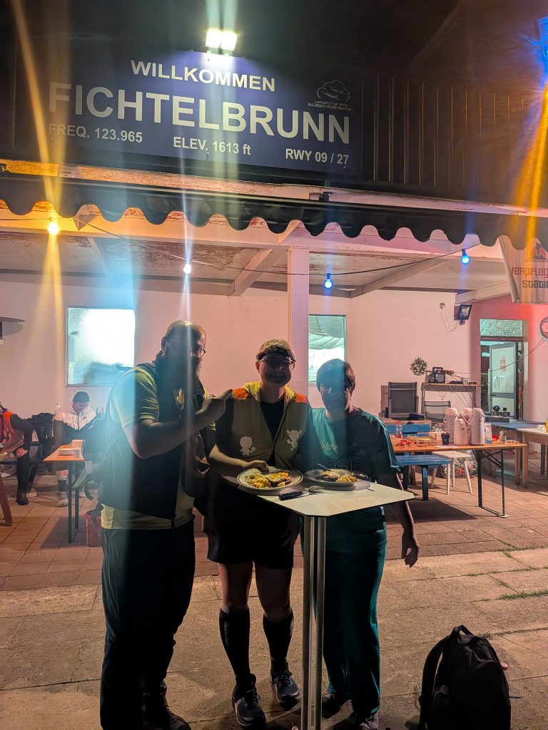 Wir gingen Etappe 1 trotzdem gut gelaunt und auf Etappe 2 an der Versorgungssation in Illschwang stießen Volker und Buddy zu uns um uns nach Sulzbach wieder zurück zu begleiten. Wir hörten, dass einige Teilnehmende aufgrund der Hitze aufhören mussten und hofften, dass uns das nicht zum Verhängnis wird. Zurück in Sulzbach wartete Andy auf uns, der uns auf Etappe drei und weiter durch die Nacht begleiten wollte. In der Station angekommen machten wir wieder Pause und stärkten uns.